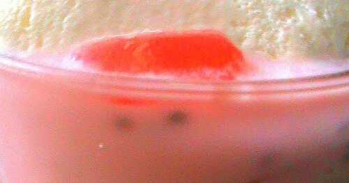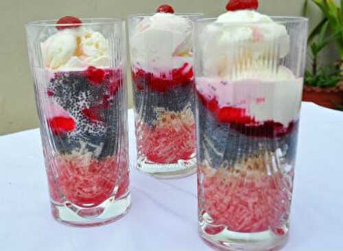 A refreshing dessert drink made with layers of strawberry jelly, fresh fruits, nuts and ice cream.