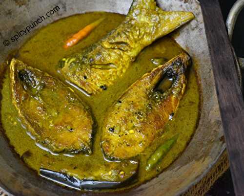 Ilish macher tel jhol aka begun diye ilish macher jhol is a pure Bengali delicacy and one of the most popular and beloved hilsa fish recipe which is frequently prepared in every Bengali house.