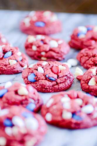 Super soft and thick red velvet cookies with white chips and M&Ms.