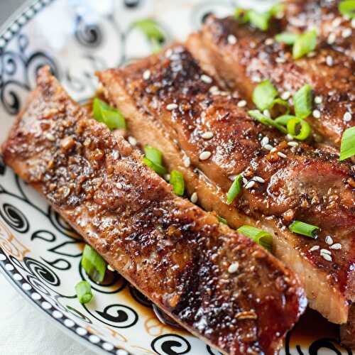 This Asian roasted pork belly has a crisp outside while the inside is so tender it almost melts in your mouth! With some rice or veggies, it makes a quick and easy 30 minute dinner for any day of the week.