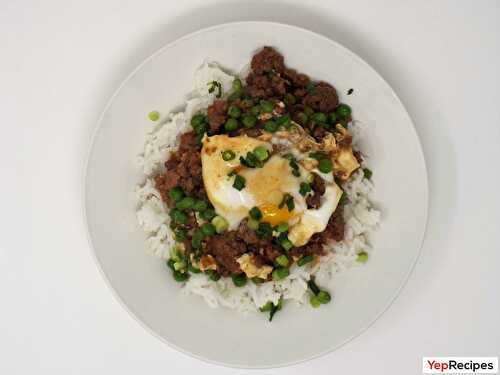Ground pork and beef simmered in a sweet- spot ginger sauce with peas and topped with a egg.