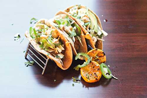 This salmon avocado taco recipe includes a smoky guacamole on top blackened chili rubbed salmon and shaved cucumber.