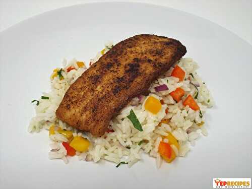 Mahi-mahi is pan sear creating a spicy crust then serve over a cold rice salad studded with peppers, cilantro, and mango.