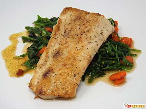 Coriander spiced mahi mahi pan seared and served with greens, carrots, and browned butter.