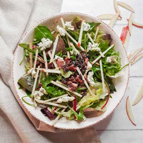 Crisp green leaves, sweet red apples, coupled with bacon, black pudding and blue cheese make this a wonderfully hearty winter salad recipe.