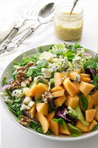 A crisp Green Salad with Cantaloupe and Blue Cheese is the perfect summer side salad! The Creamy Orange Champagne Vinaigrette tops off the salad.