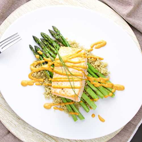 A Spanish Style Salmon fillet on a bed of quinoa and green asparagus topped with a nutty Romesco Sauce is great way to bring a little Mediterranean sun to your plate.