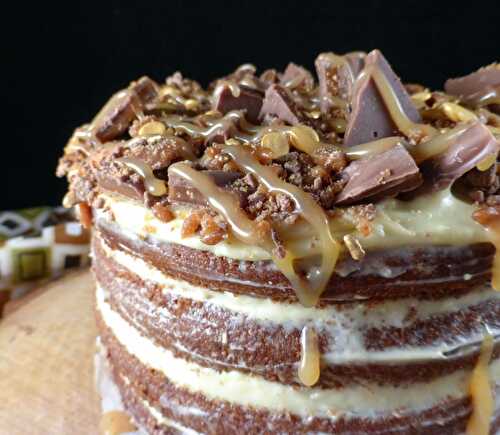 This Daim layer cake has homemade butterscotch sauce in the cake and a butterscotch buttercream frosting.
