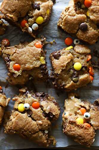 Chocolate chip cookie bars swirled with creamy peanut butter and loaded with Reese's pieces and milk chocolate chips.