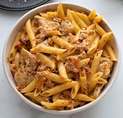 Sun-dried tomato pasta with a touch of cream, chicken, toasted pine nuts and basil is the ultimate comfort food.