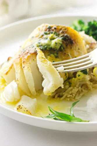 Wild-caught broiled cod with lemon tarragon butter is one of the healthiest dinners ever! A moist and flaky cod fillet topped with a slice of lemon tarragon butter at serving.