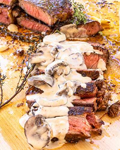 These perfectly seared NY Strip steaks with a creamy mushroom gorgonzola sauce are savory, decadent, and incredibly simple to make.