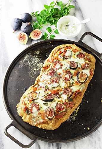 This flatbread is made with a thick einkorn whole wheat crust, a garlic Gorgonzola sauce, Black Mission Figs, salty Prosciutto and fresh snipped oregano.