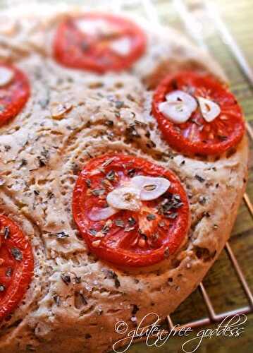 Wonderful gluten-free rustic bread, focaccia style with tomatoes and garlic.