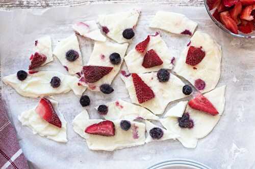 Use greek yogurt, strawberries, and blueberries to make a healthy and refreshing Greek Yogurt Bark for 4th of July.