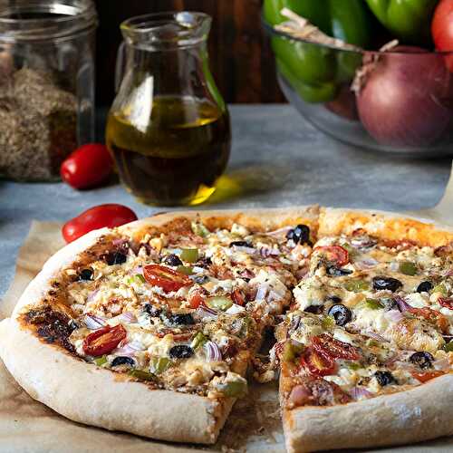 This Greek pizza is vegetarian and has all the toppings you love like feta cheese, Kalamata olives and olive oil.