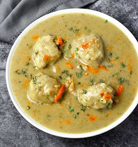 Amazing Vegan Chicken And Dumplings is so flavorful with seasoned soycurls cooked in vegetable broth with aromatics, herbs and vegan,gluten-free dumplings.