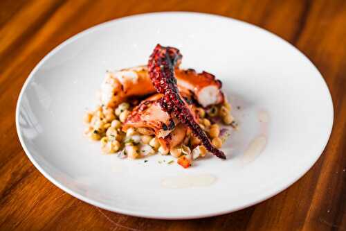 Spanish-style tender and crisply grilled octopus with a tangy preserved lemon vinaigrette and roasted potatoes.