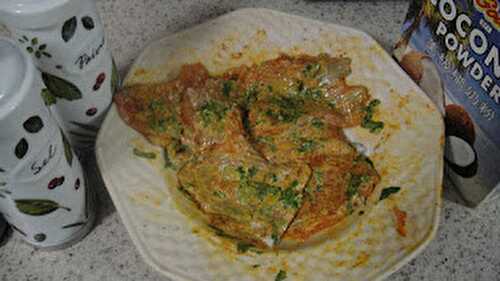 Ingredients:Rainbow trout filets cut into 8 -10 piecesCumin powder – 1/2 tspnRed chilly powder – 1 heaped tspnBlack pepper ground – 1/2 tspnCoconut powder – 4 tblspnsOlive oil – 2 tblspnsFresh cilantro choppedSalt to taste Method: Clean, rinse and dry.