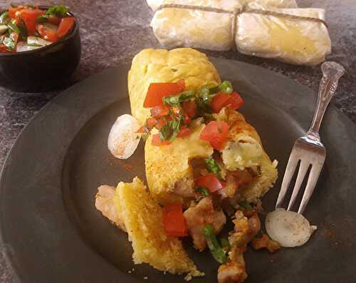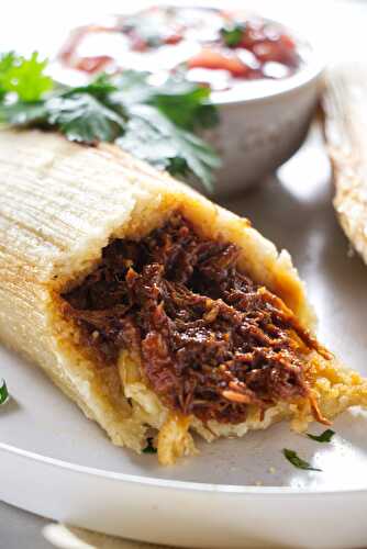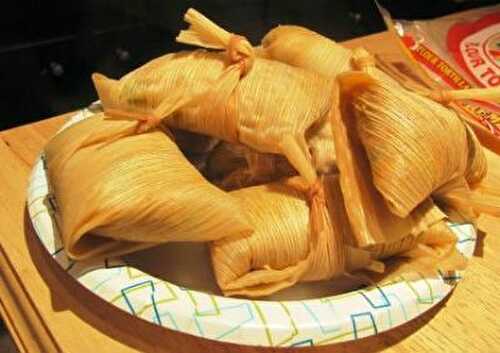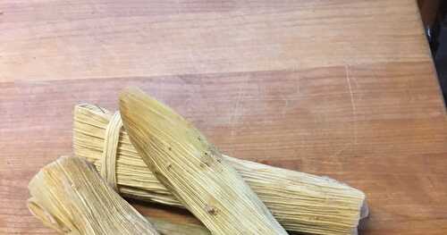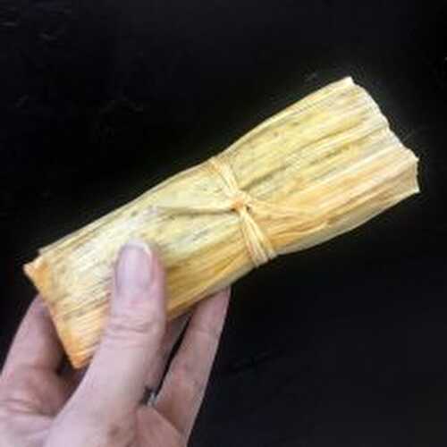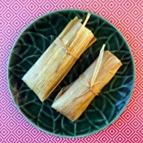 Traditional Mexican street food: a dense corn dough stuffed with carnitas and steamed in a corn husk