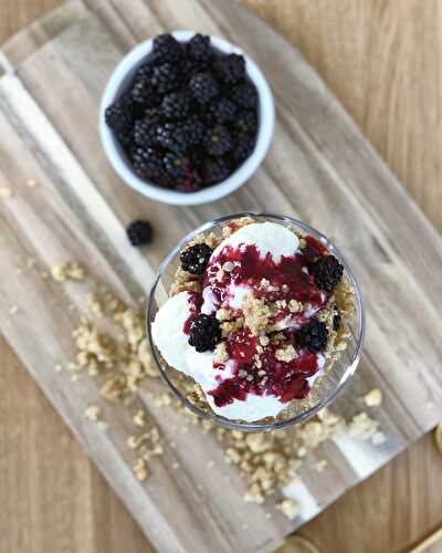 Creamy vanilla gelato rippled with blackberry coulis, topped with buttery crumble.