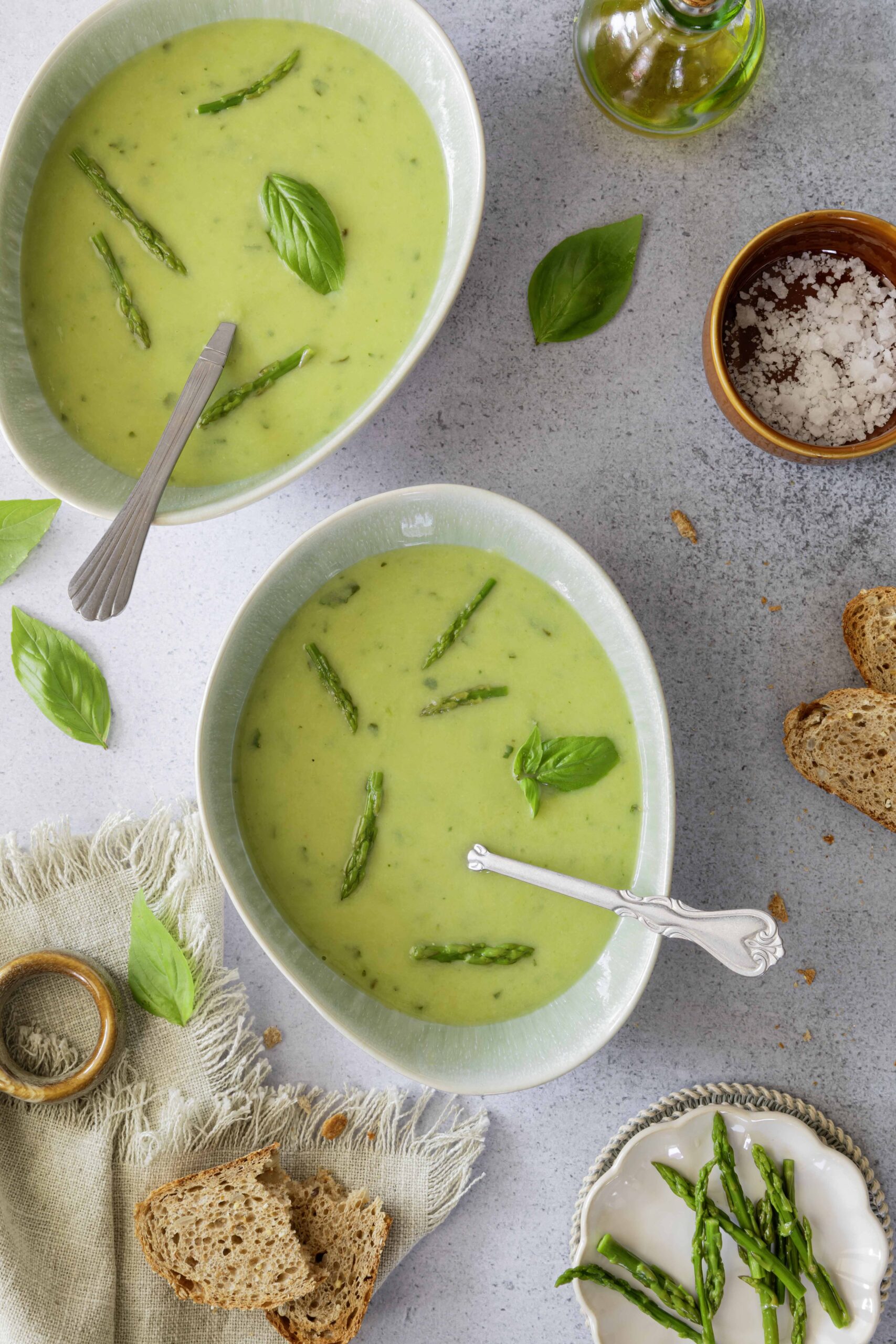 Refreshing and full of vitamins chilled asparagus soup with avocado and basil.