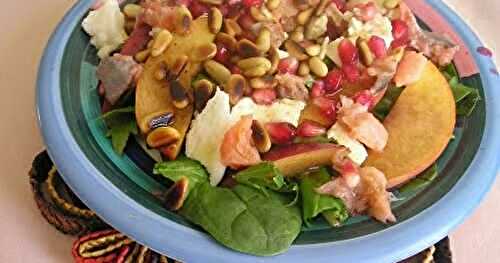 Serves 6 4 ripe peaches 250 gr mozzarella 150 gr smoked salmon a handful of fresh basil leaves (I used fresh spring mix) 50 gr pome.