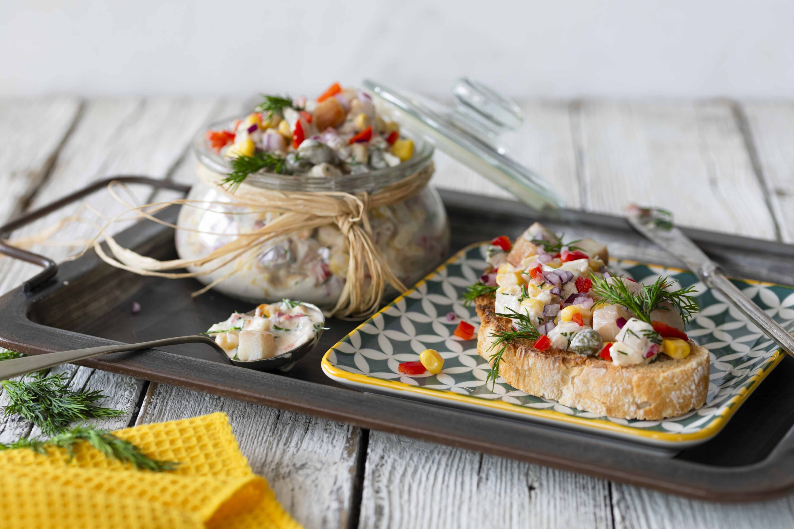 Toast with homemade smoked mackerel salad, tasteful, deliciously spicy