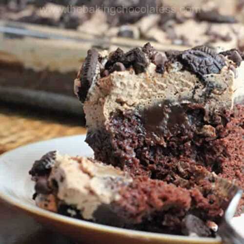 This Oreo dump cake is an incredibly easy 5-ingredient dessert that takes practically no effort to put together! It has layers of Oreo cookies, caramelized sweetened condensed milk, boxed chocolate cake mix, and creamy Cool Whip.
