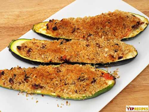 Chunky sausage, creamy cheese, peppers, and onions baked into zucchini boats and then topped with garlic breadcrumbs.