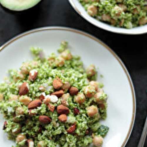 This delicious raw broccoli salad with chickpeas, avocado and almonds is vegan and requires only 7 ingredients!