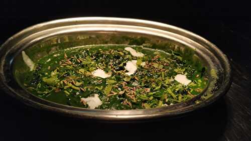 This is a healthy palak recipe where crisp fried methi leaves are mixed with palak paste and seasoned with cumin seeds and other spices.