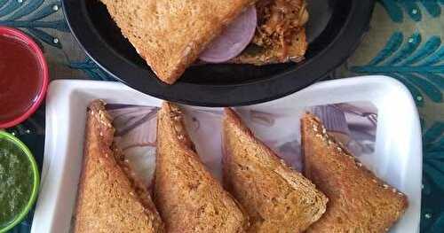 A sandwich made with a spicy preparation of cooked carrot and capsicum stuffing along with some cheese and fresh vegetables.