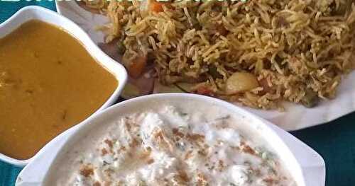 Vegetable Boondi Raita is seasoned yoghurt with herbs and vegetables.