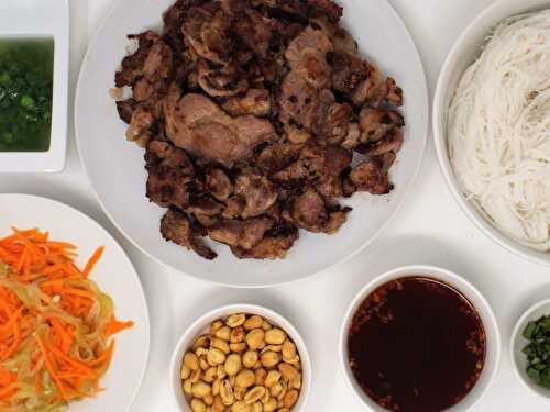 Marinated pork shoulder pan fried and served with rice noodles, pickled vegetables, and various sauces and garnishes.