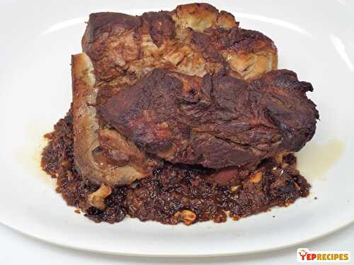 Pork shoulder braised in the oven with red cabbage, vinegar, and spices.