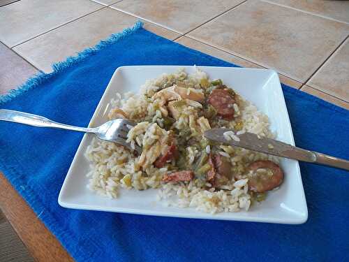 A thick Cajun spiced stew with chicken, andouille sausage, onion, and peppers served over steamed rice.