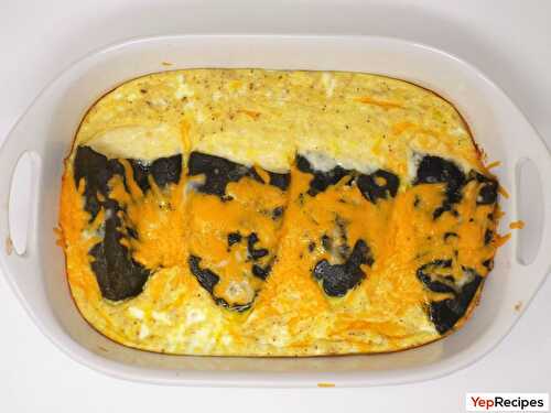 Roasted poblano peppers stuffed with Monterey Jack cheese then baked in an egg batter topped with cheddar.