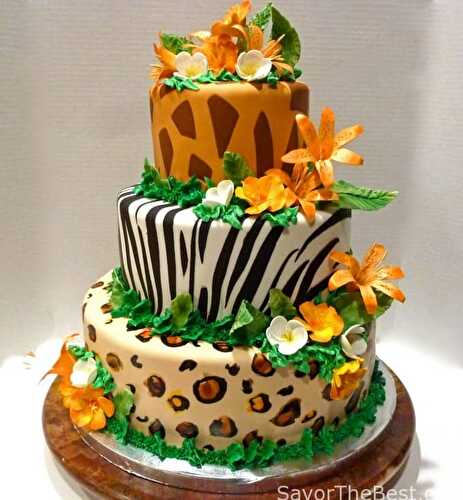 A tropical jungle cake design with zebra, giraffe and leopard designs and tropical gumpaste flowers.
