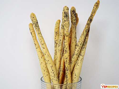Thin and crispy Italian style breadsticks topped with poppy seeds.