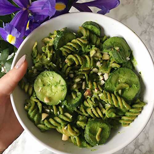 A homemade pesto sauce made with fresh baby spinach, walnuts, garlic, Parmesan, and olive oil.