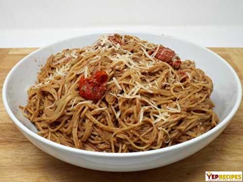 Angel hair pasta tossed with a pesto sauce made of cherry tomatoes, toasted walnuts, basil, garlic and Parmesan cheese.