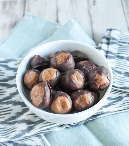 Healthier buckeye balls are naturally sweetened and less sweet than the traditional buckeye balls.