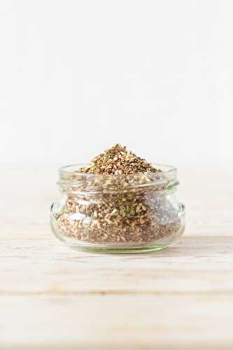 Amazingly flavorful homemade Za'atar spice blend with toasted sesame seeds, dried herbs and sumac.