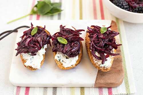 An elegant party dish that's really simple to make - crusty grilled bread, creamy goat's cheese, and an easy red onion and balsamic blackberry compote!