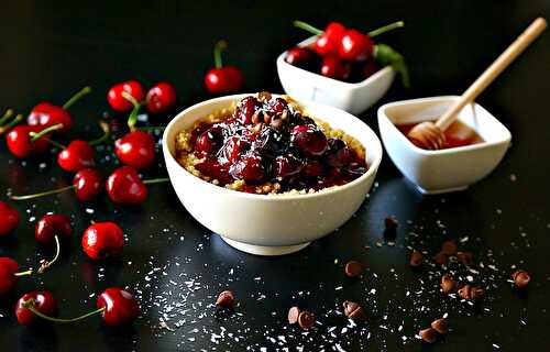 A cherry compote that is sweetened with honey & flavored with rose water.