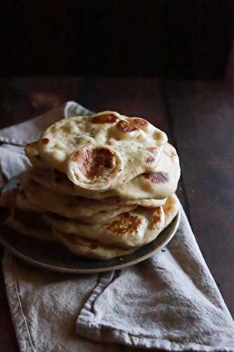 Soft Indian garlic and thyme Naan bread dough has complex flavors like yogurt, milk, sugar, butter, egg and all-purpose flour, with yeast or baking soda to aid fermentation.