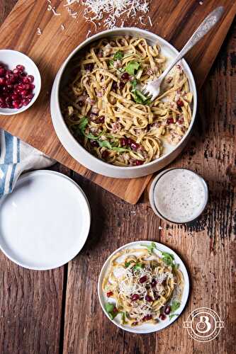 This Healthy Carbonara Pasta recipe is made with a lightened-up creamy garlic cauliflower cream sauce that feels as indulgent as it is good for you! (no eggs no cream)