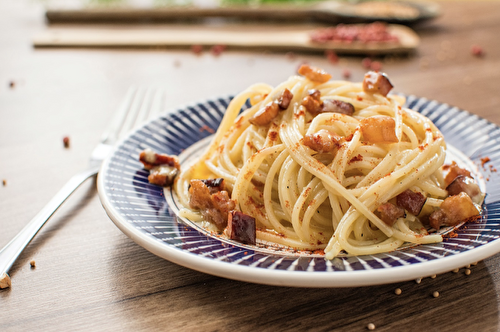 Who would've thought that pasta carbonara is without cream? Try it now with amazingly fresh pasta in the blink of an eye!