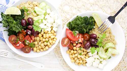 Greek Buddha Bowl is a great hearty vegetarian dish filled with Greek feta, chickpeas, kamut couscous, cucumber, tomato, kale chips and kalamatas olives topped with a greek dressing for a healthy a…